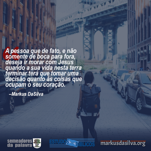 A pessoa que de fato, e não somente de boca para fora, deseja ir morar com Jesus quando a sua vida nesta terra terminar terá que tomar uma decisão quanto às coisas que ocupam o seu coração. Note, porém, que Jesus e o próprio Pai nos disse que precisamos amá-lo de todo o coração e não em parte, e nem mesmo quase todo, mas todo. Ou seja, se além de Deus ainda existe espaço na vida para qualquer outro interesse; se as coisas que há no mundo ainda têm acesso ao coração através daquilo que a pessoa lê, assiste, ouve ou participa, então ela está enganando a si mesmo e o amor do Pai não está nela, bem simples.